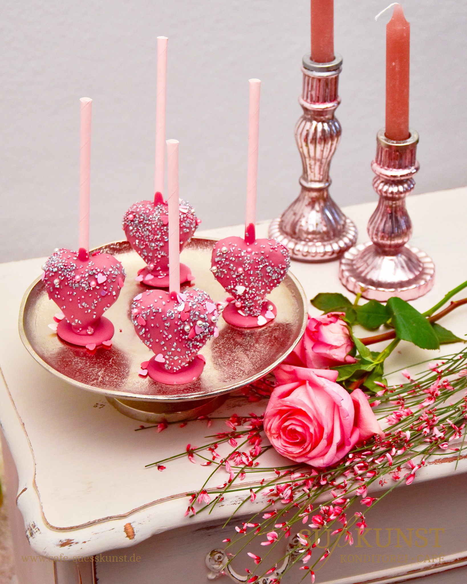 Süßes Herzchen am Stiel: Schokoladenkuchen & Schoko-Creme mit Ruby-Schokolade überzogen und Herzchen-Glitzer verziert.