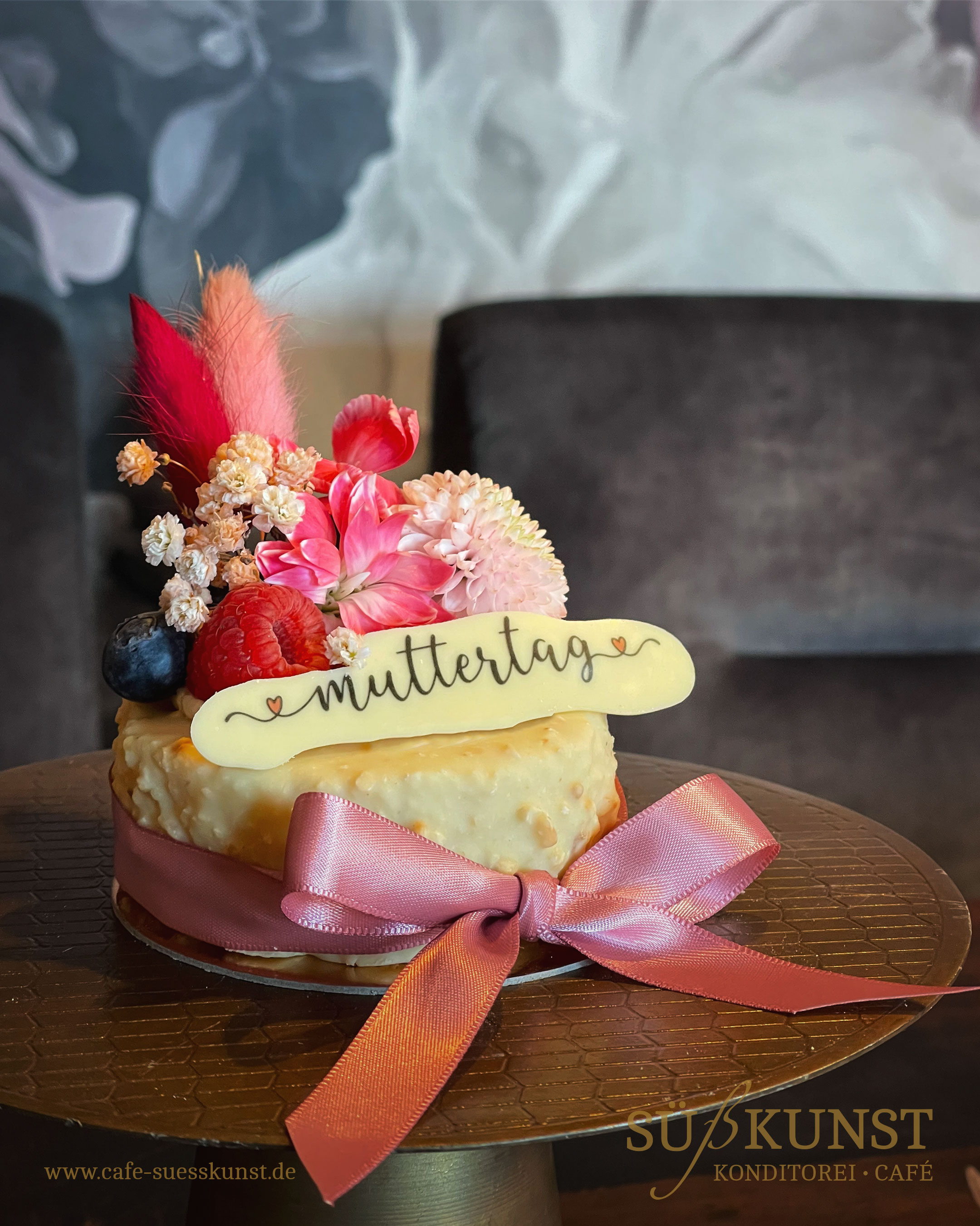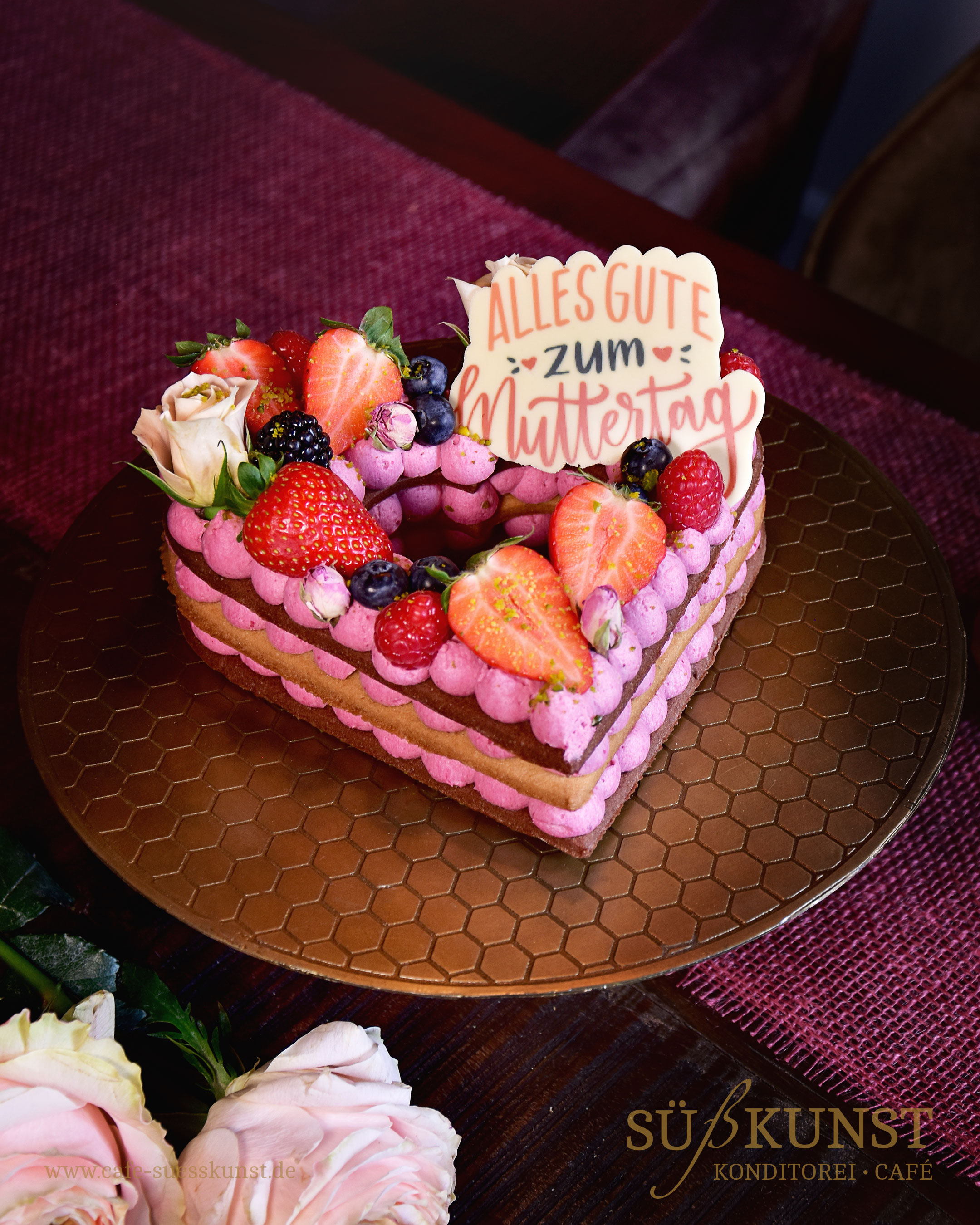 Schokoladen-Butter-Sablé mit Waldbeer-Frischkäsecreme Füllung und frischen Beeren und echte Blumen als Deko. Dazu ein Schokoladen-Aufleger "Alles Gute zum Muttertag". Etwa 6 Portionen
