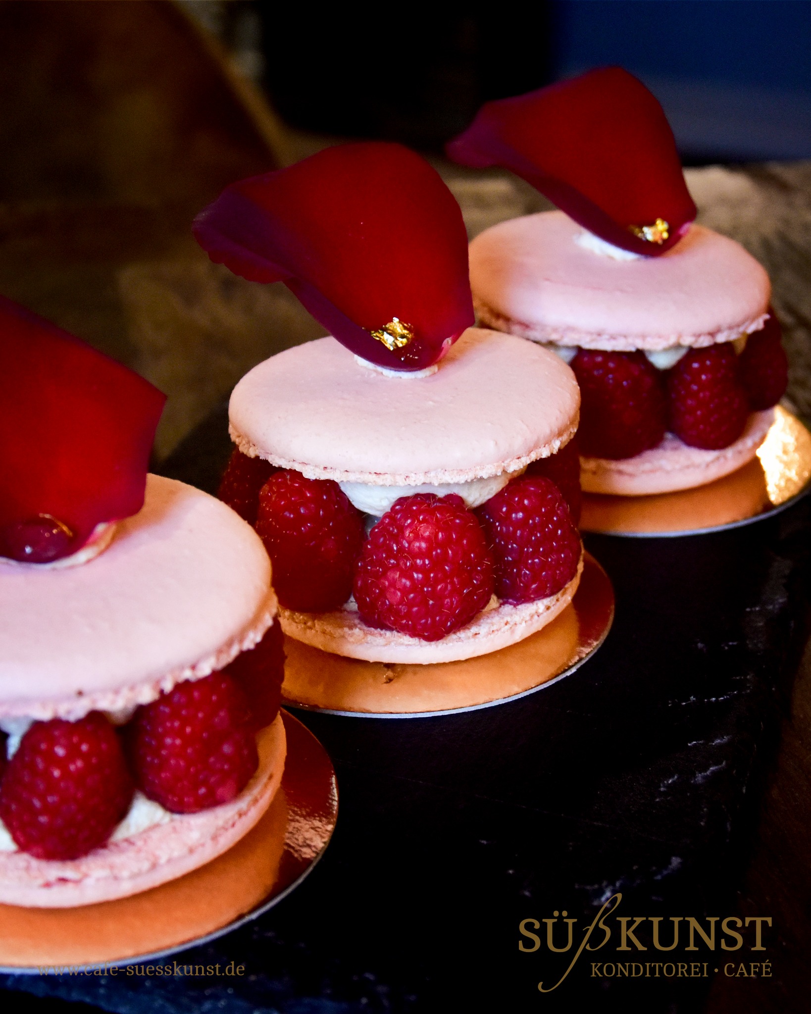 Feines Mandel-Baiser mit französischer Litschi-Buttercreme, abgeschmeckt mit Rosenwasser und frischen Himbeeren.
