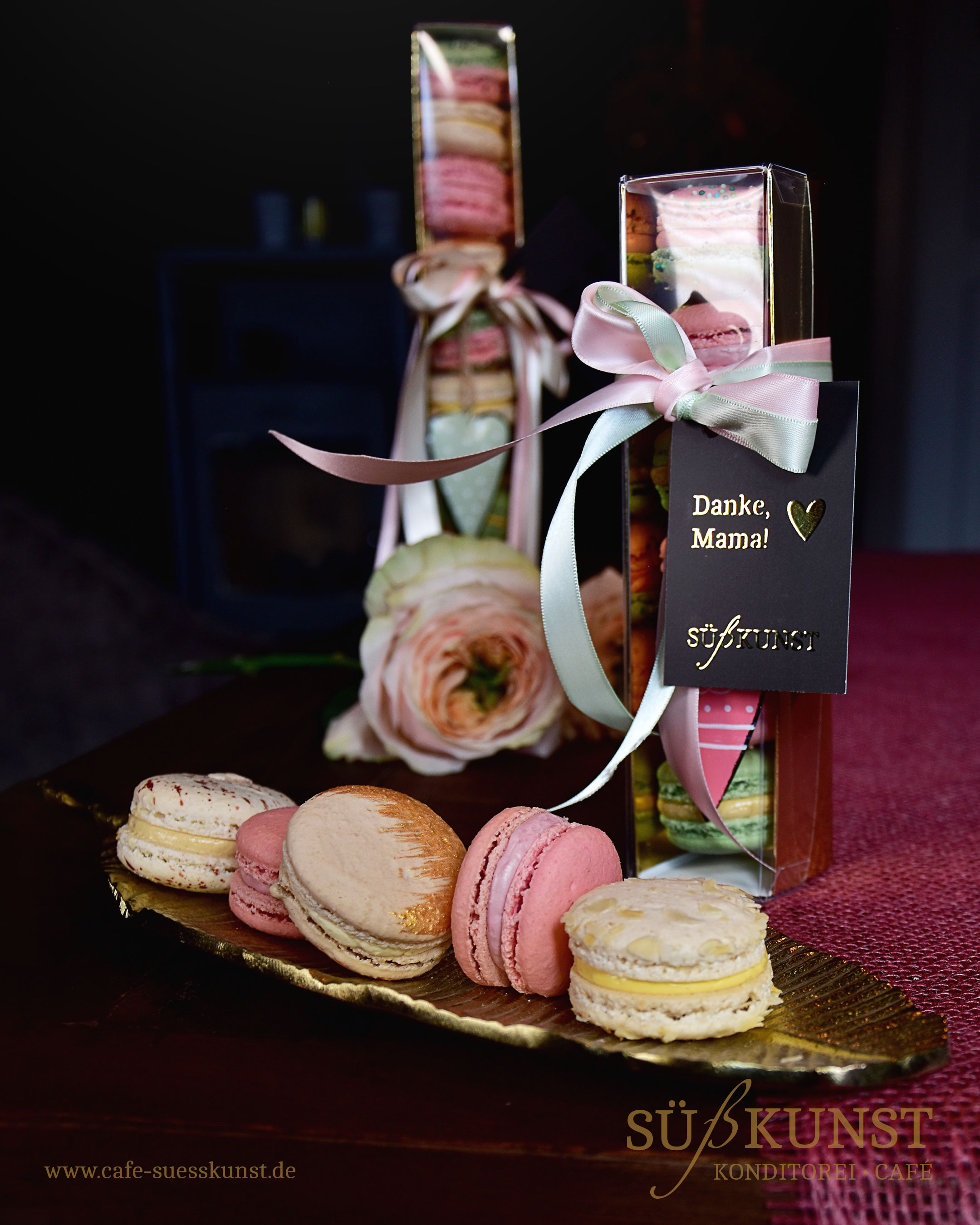 6 Macarons in den Geschmacksrichtungen Pistazie, Gebrannte Mandel, Vanille und Erdbeere. In der goldenen Geschenkbox mit Muttertag - Geschenkanhänger.