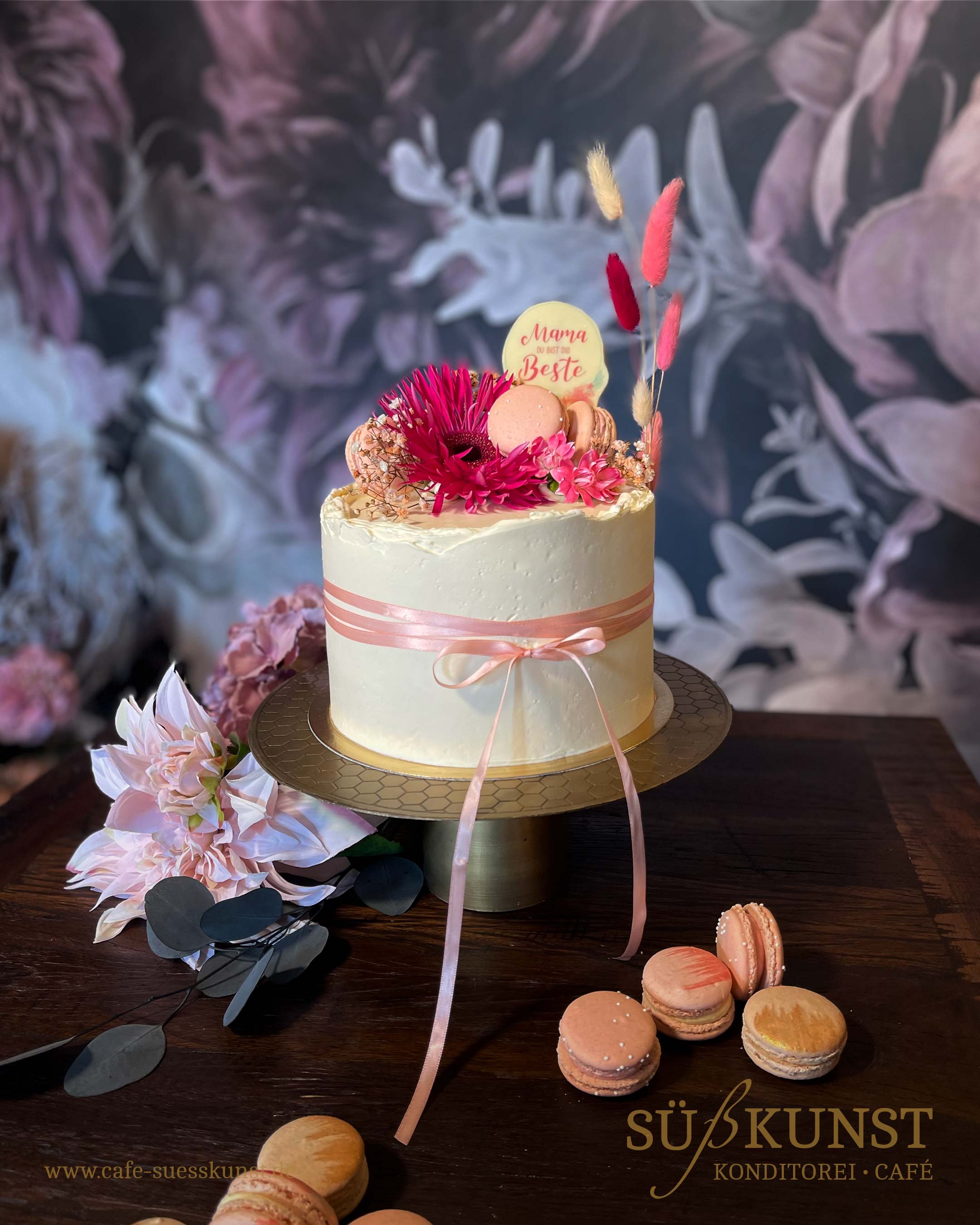 Helle Bisquit-Böden mit wechselnd geschichteter Waldbeer- und Vanille-Creme. Dekoriert mit Macarons und echten Blumen in Rosa / Pink - Tönen (Bild Beispielhaft). Etwa 8-10 Portionen.